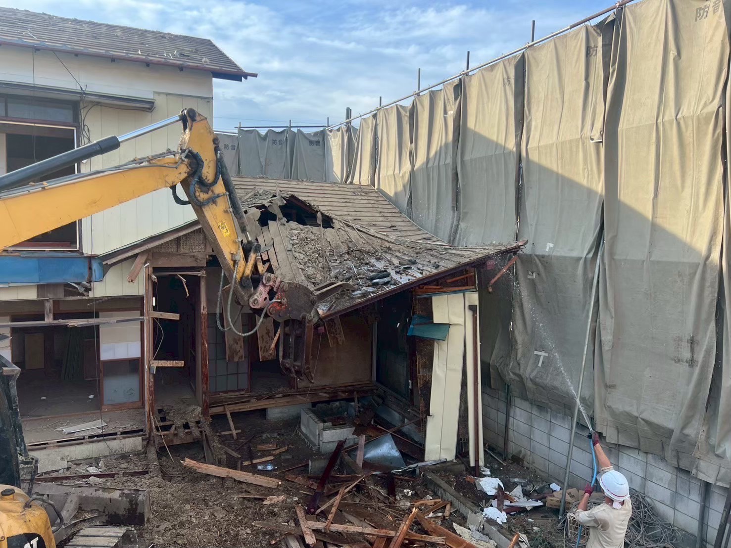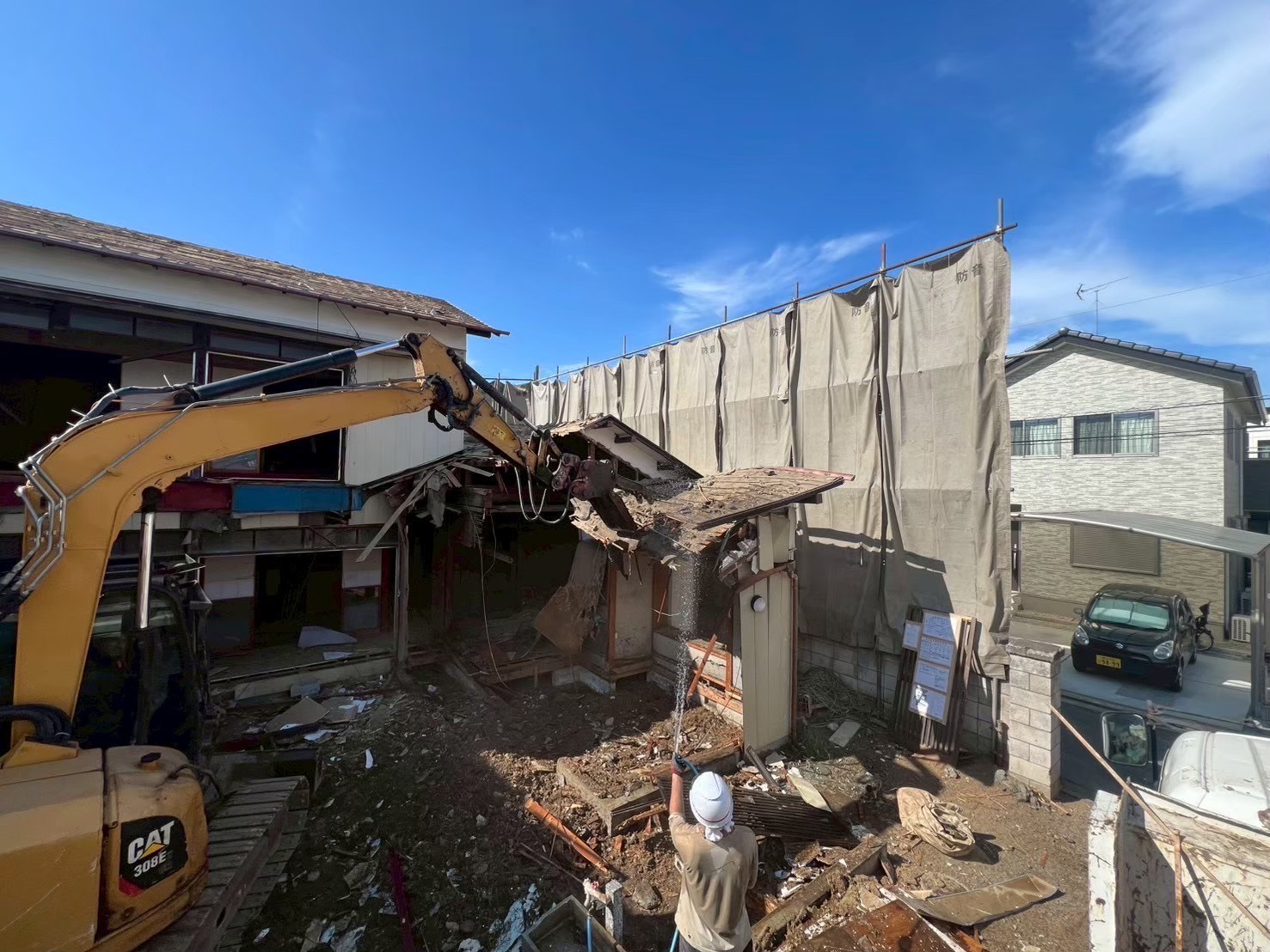 | 主な施工内容 | 今回ご依頼いただいたのは、築年数が経ち老朽化が進んだ木造2階建て住宅の解体工事です。周囲には戸建てが建ち並ぶ住宅街のため、騒音・粉じん対策や安全管理を特に徹底しながら作業を進めました。 まずは建物の周囲に足場を組み、防音シートや養生をしっかりと設置。近隣の皆さまへの影響を最小限に抑えるための重要な工程です。続いて屋内の残置物を撤去し、重機の搬入後、建物を上部から順に慎重に解体していきました。 作業中は粉じんの飛散を防ぐため、ホースで常に散水しながら解体を実施。水をまきながら作業することで視界の確保にもつながり、安全性を高める効果があります。 また、解体材は木材・金属・コンクリートなどを分別し、リサイクルを意識した丁寧な仕分けを行いました。 解体後は基礎の撤去と整地を行い、周囲とも整合の取れたきれいな更地へと仕上げています。 当社では、木造住宅はもちろん、鉄骨造・RC造などさまざまな建物の解体に対応しております。近隣への配慮を重視した安全な解体をご希望の方は、ぜひお気軽にご相談ください。 |