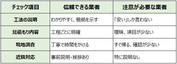 工法のメリット・デメリットを丁寧に説明してくれる業者は、現場の状況を正しく把握していることが多く、信頼できるポイントにもなります。